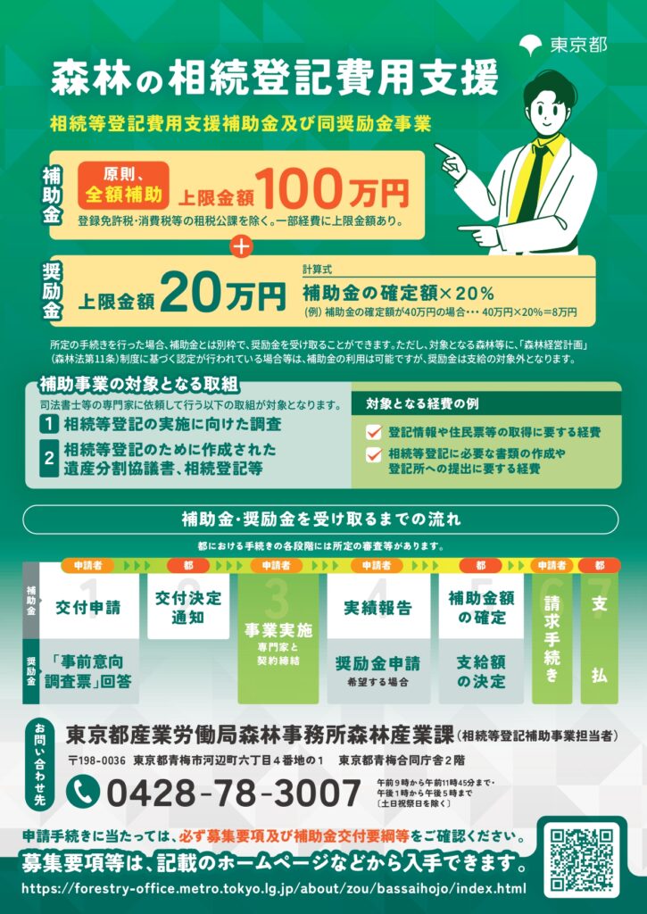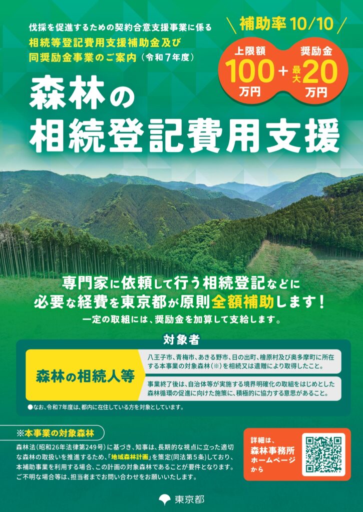 令和7年10月15日から「伐採を促進するための契約合意支援事業に係る相続等登記費用支援補助金及び同奨励金事業」の募集が開始されました。